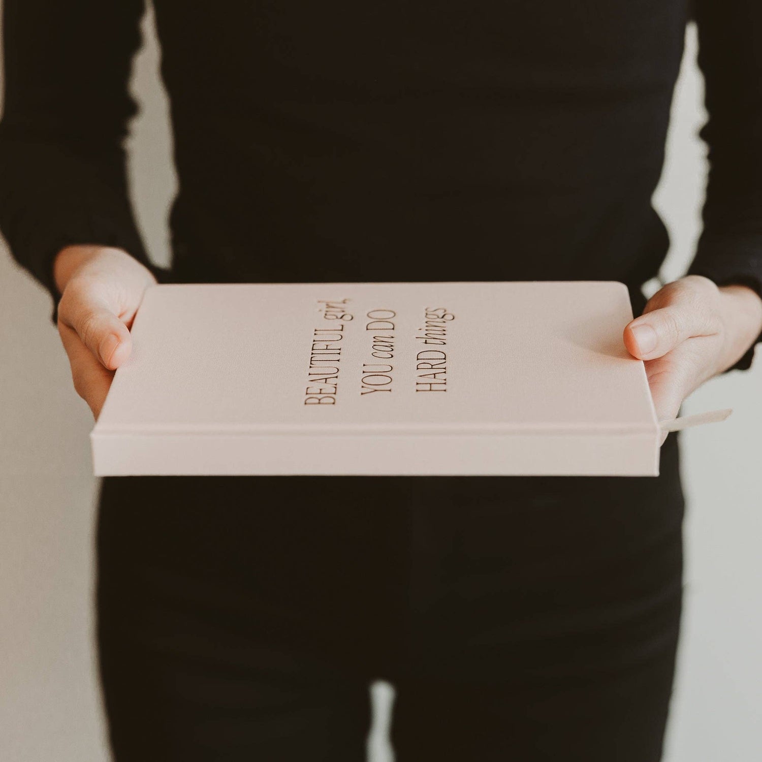 Attend your next meeting or class with a reminder that you are capable of anything. This stunning light pink journal features gold foil accents and 100 pages ready to be filled with your important notes, thoughts, and dreams. DETAILS: • Size: 8.1" x 5.6" x .6" • Design: Beautiful Girl, You Can Do Hard Things • Light Pink Fabric Journal with Gold Foil Details • 100gsm Uncoated Lined Paper • Ribbon Bookmark in Gold • 100 Pages Front and Back (200 Total) • Birthday, Mother's Day, Desk Accessories, Office Accessories, Stationery, Planner, Journal, Diary, Notebook, Graduation, Encouragement, Motivational, Inspirational, Self-Care, Back to School, Teacher Appreciation