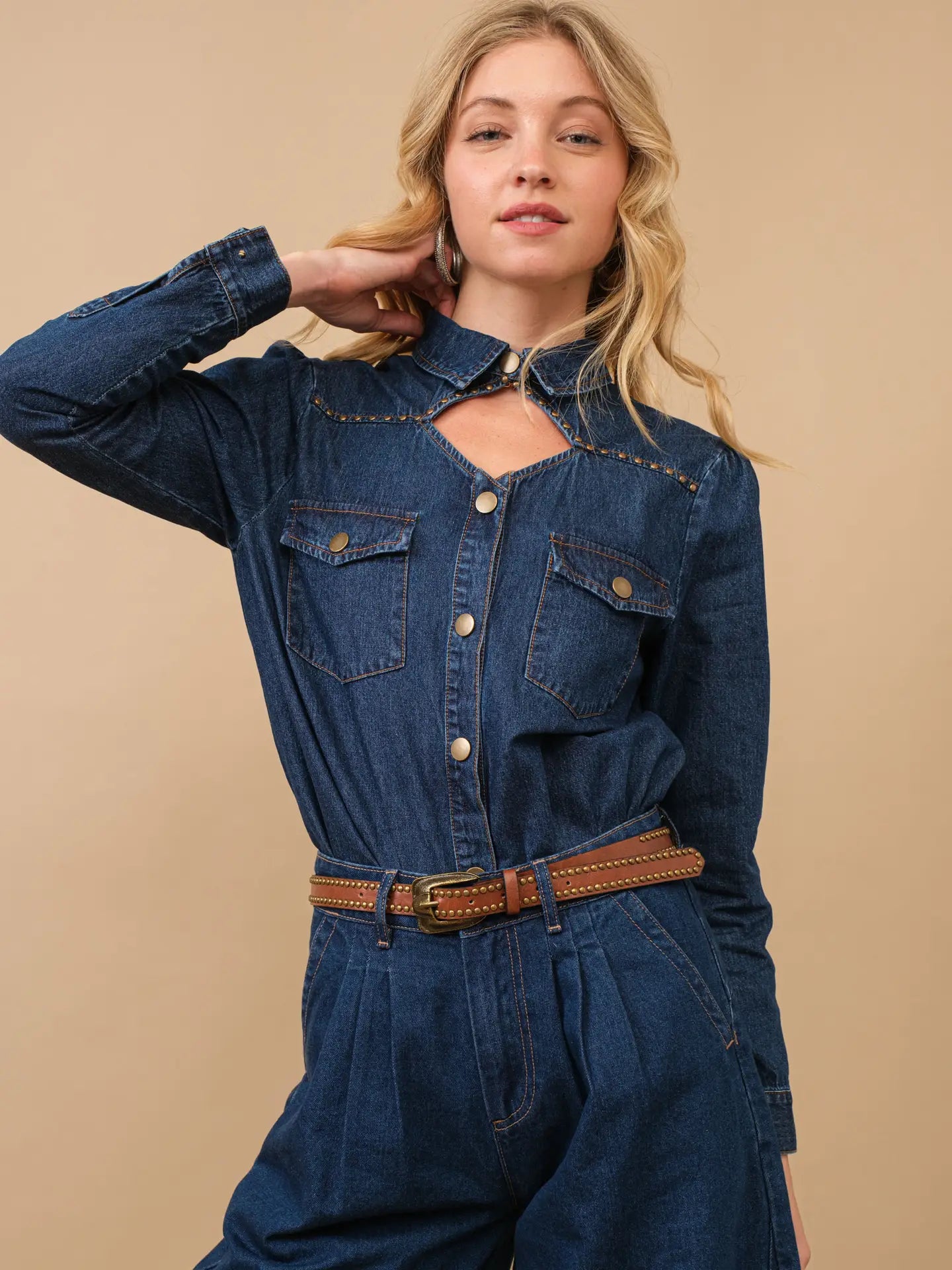 Garment Washed Chambray Snap Up Cut Out Neck Studded Collard Shirt Blouse