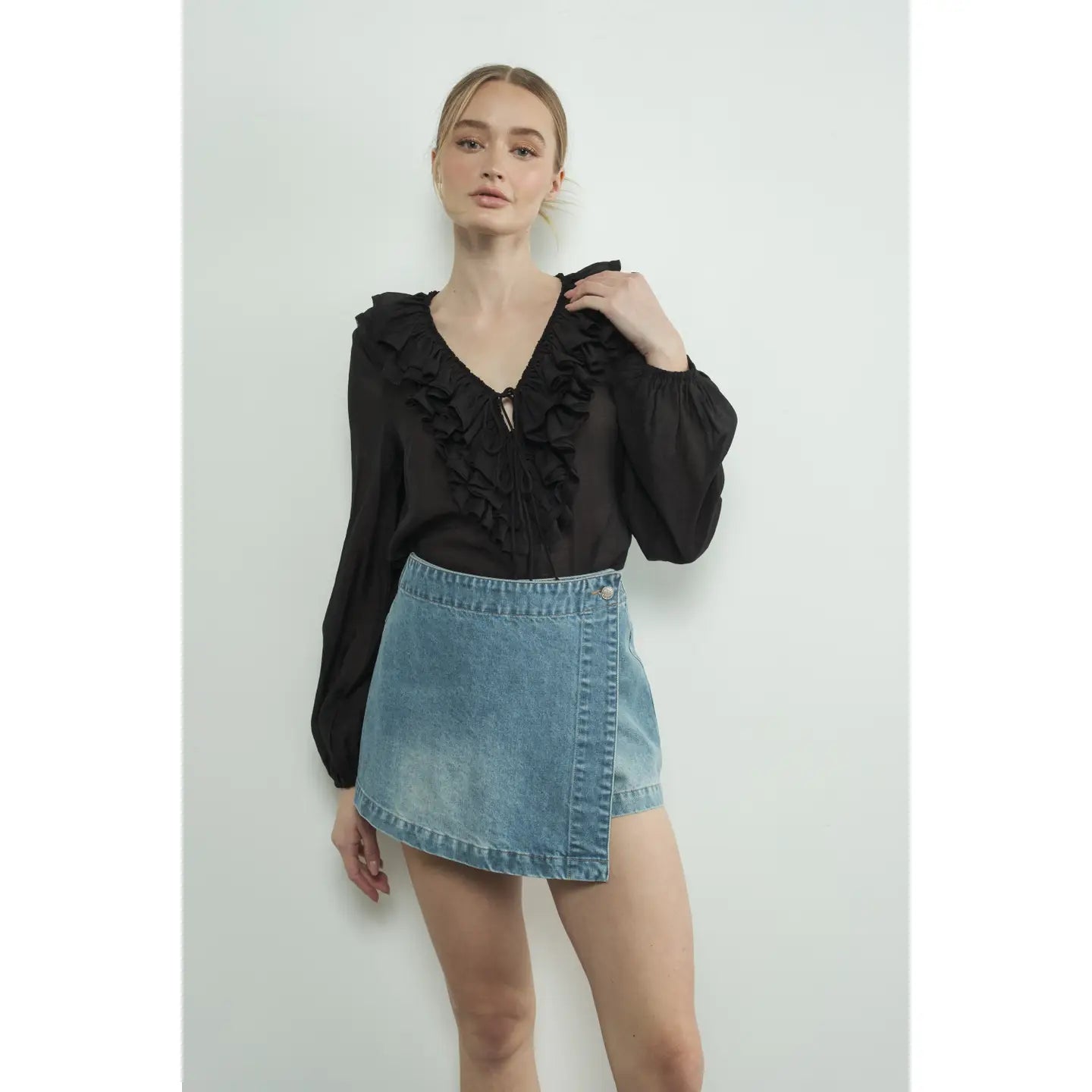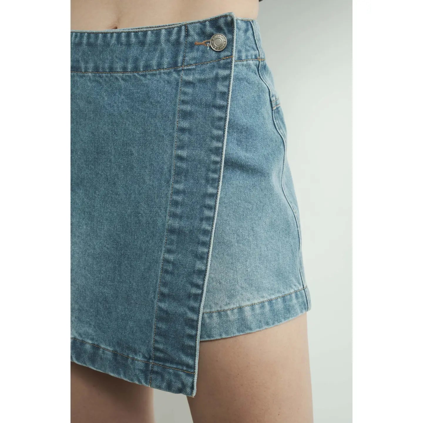 This mini denim skort is so classic and versatile, This skort features a side-tie wrap silhouette and asymmetrical design with button closure for an effortless touch of edge. mini length -Skort -Mini