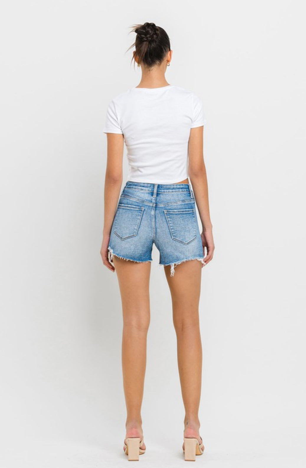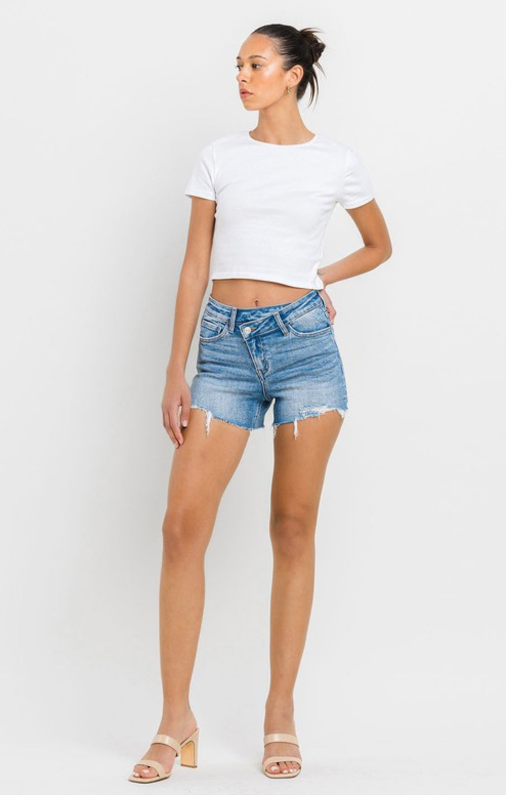 Comfort stretch denim, high-rise waist, distressed detail, criss-cross shorts.