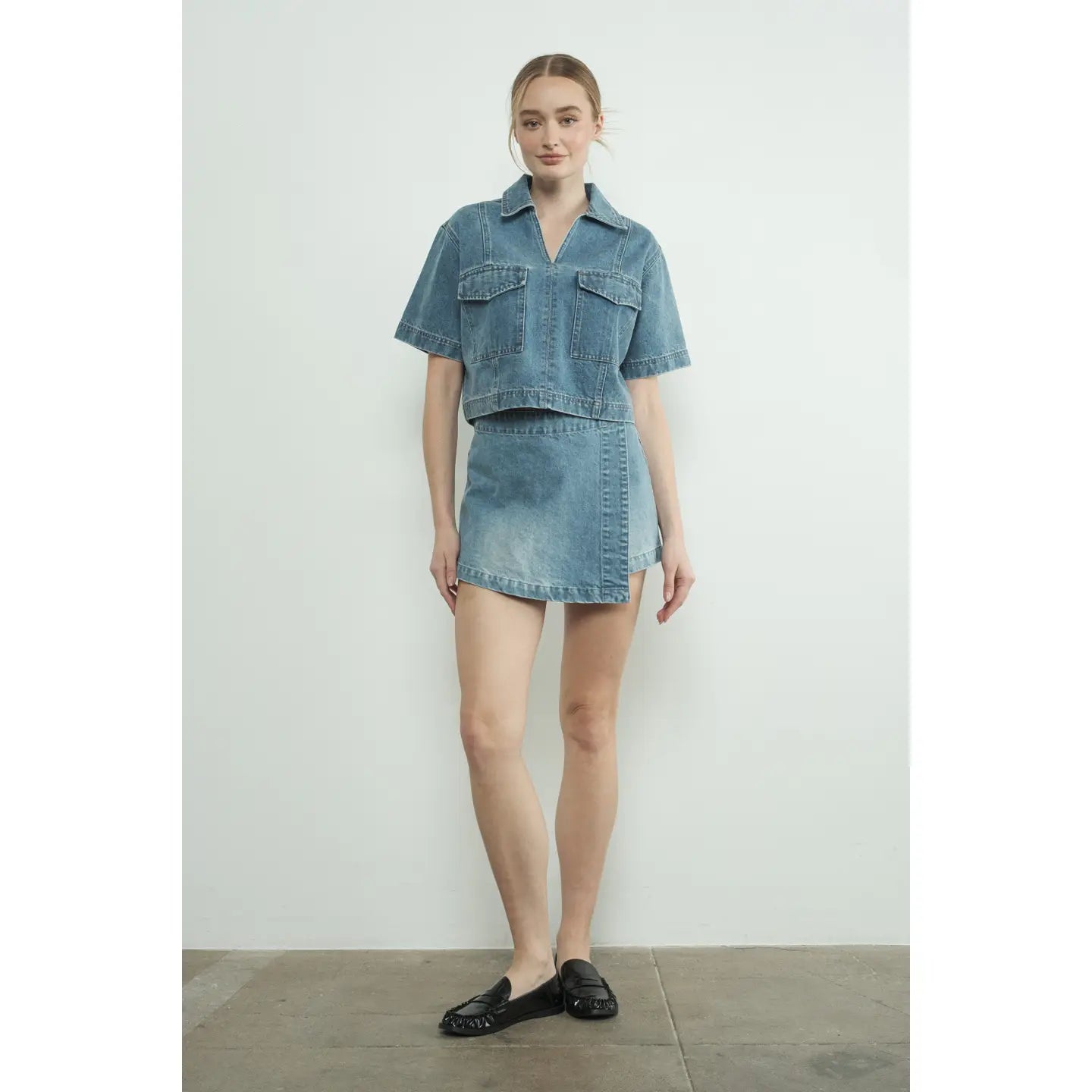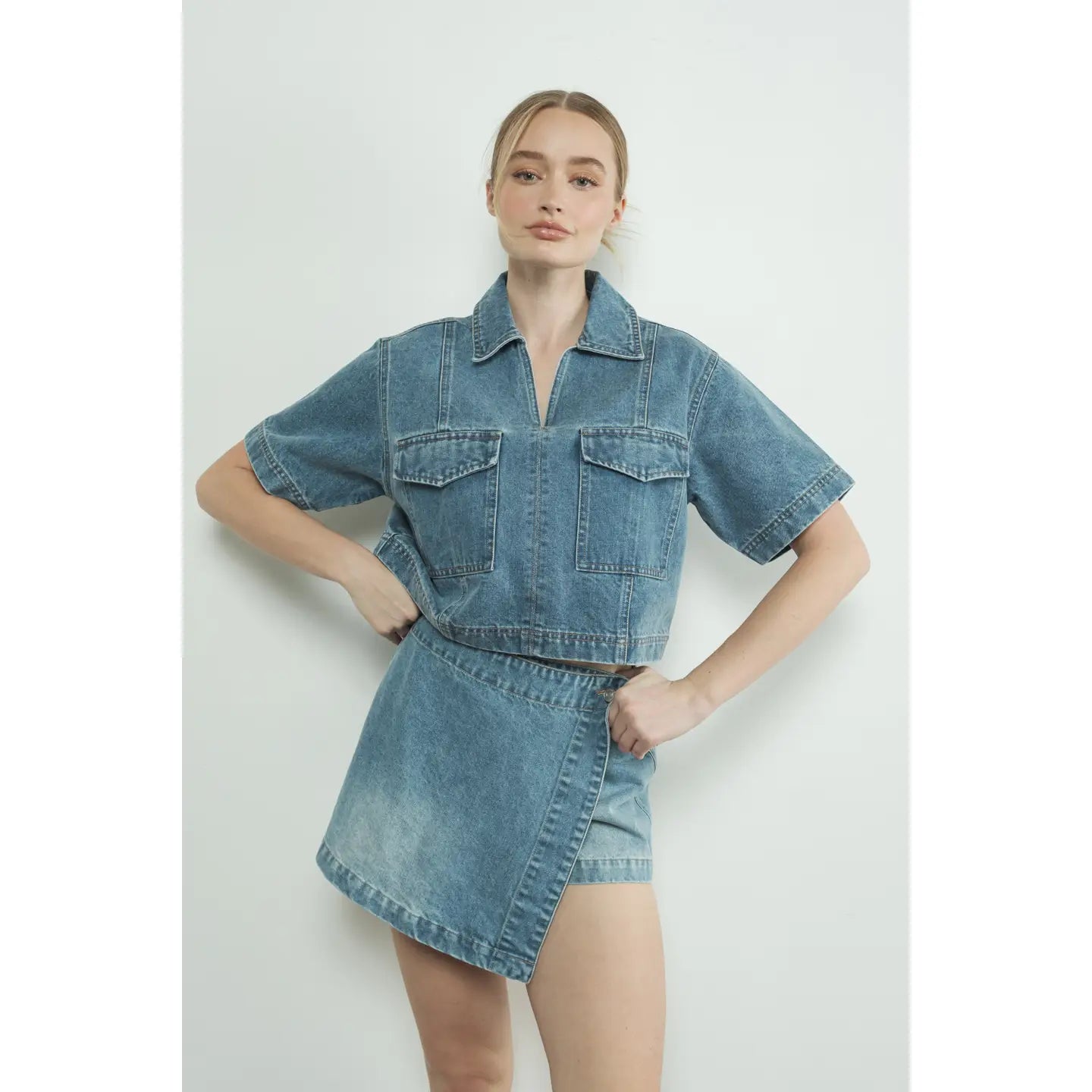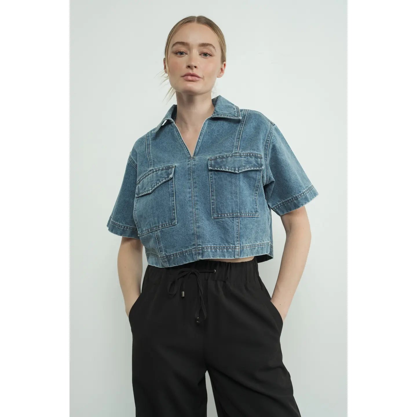 this cropped v-neck denim top exudes effortless style with its contemporary design and attention to detail. Crafted from a thick denim. It comes with patched pockets and has a straight, slightly boxy fit. This top features a v neck with basic collar, split neckline, seam detailing, dropped short sleeves, cropped, and oversized fit. making it ideal for transitioning between seasons.