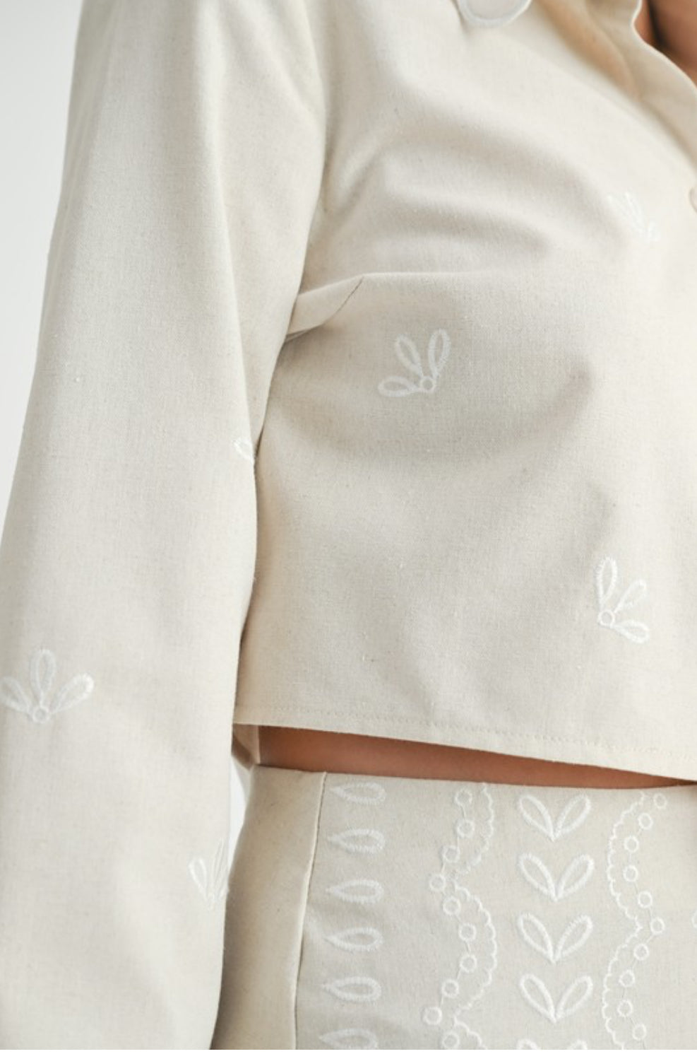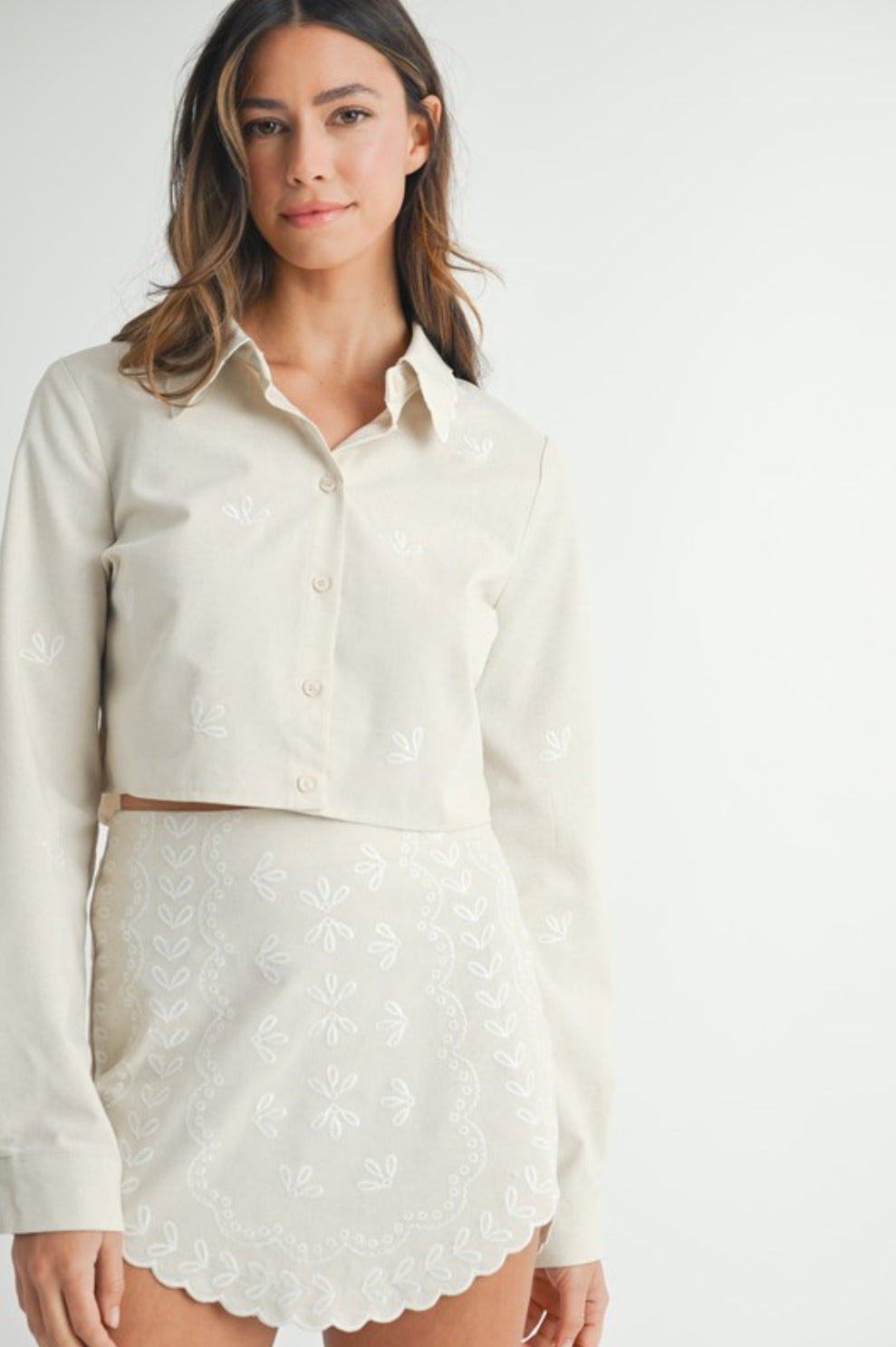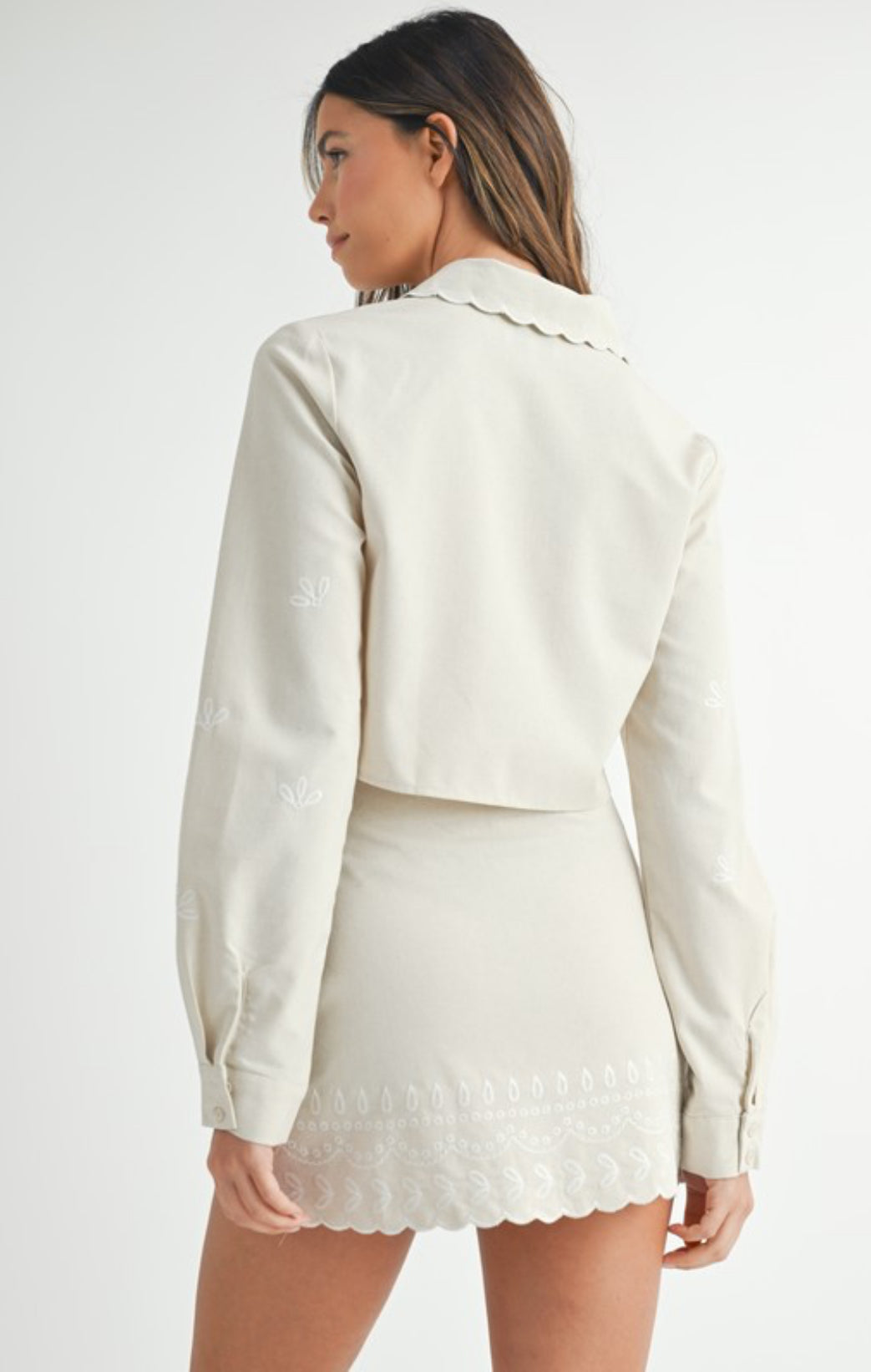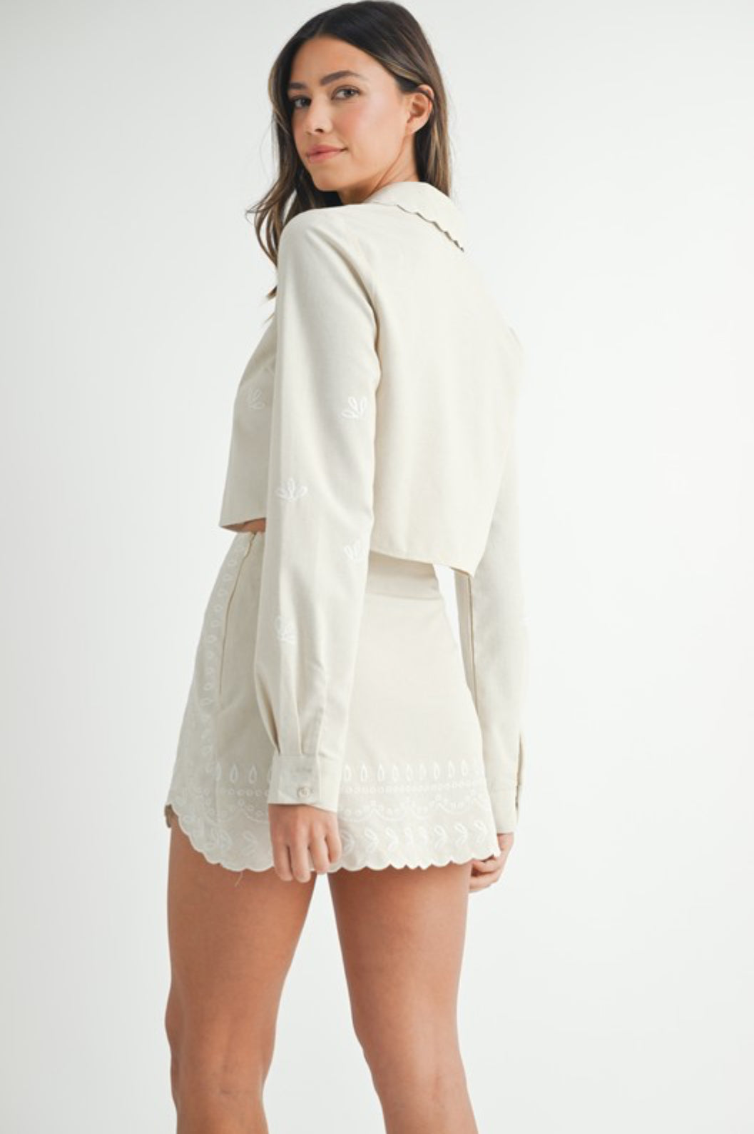 Long Sleeve embroidered button down crop top shirt and matching scallop hem detail mini skirt set. Skirt has side invisible zipper.