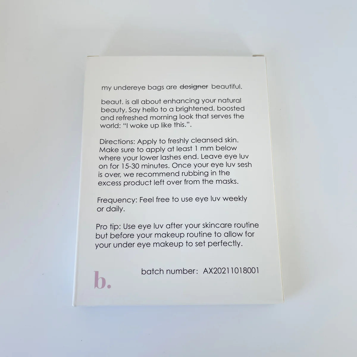 Directions: Apply to freshly cleansed skin. Make sure to apply at least 1 mm below where your lower lashes end. Leave eye luv on for 15-30 minutes. Feel free to apply the excess serum from the packaging after your eye luv session.