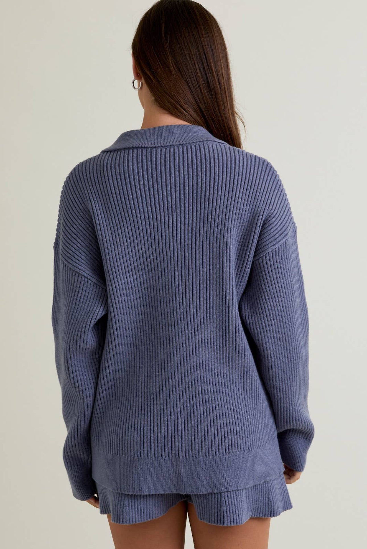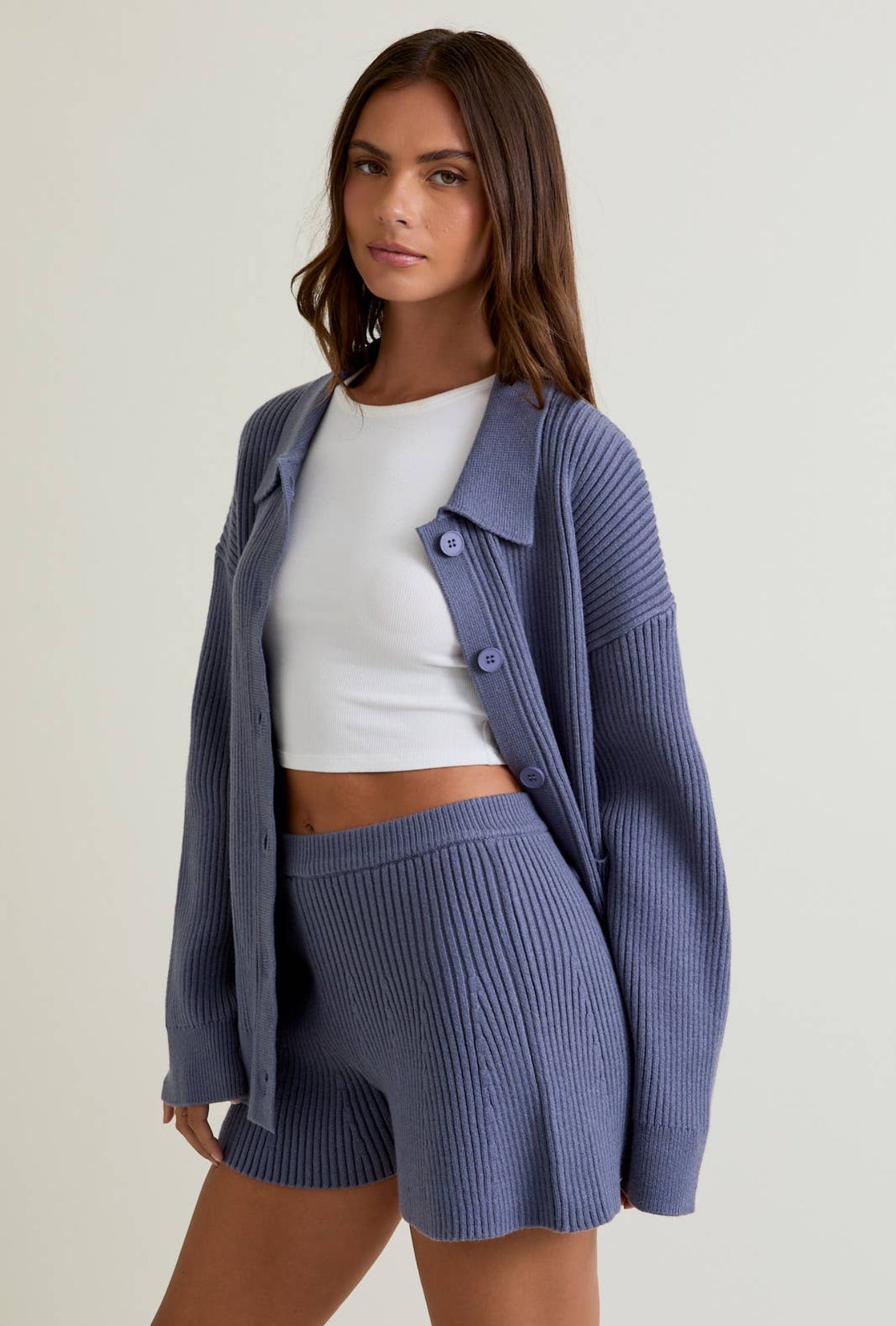 A cozy-meets-chic essential, the Bluebell Ribbed Knit Set features a matching button-down cardigan and high-waisted knit shorts in a soft ribbed texture. Designed with an oversized fit, drop shoulders, and front patch pockets, the cardigan offers effortless layering, while the shorts provide a flattering, relaxed silhouette with a stretchy waistband for all-day comfort. The muted periwinkle blue hue adds a modern, feminine touch that’s perfect for lounging or laid-back outings.