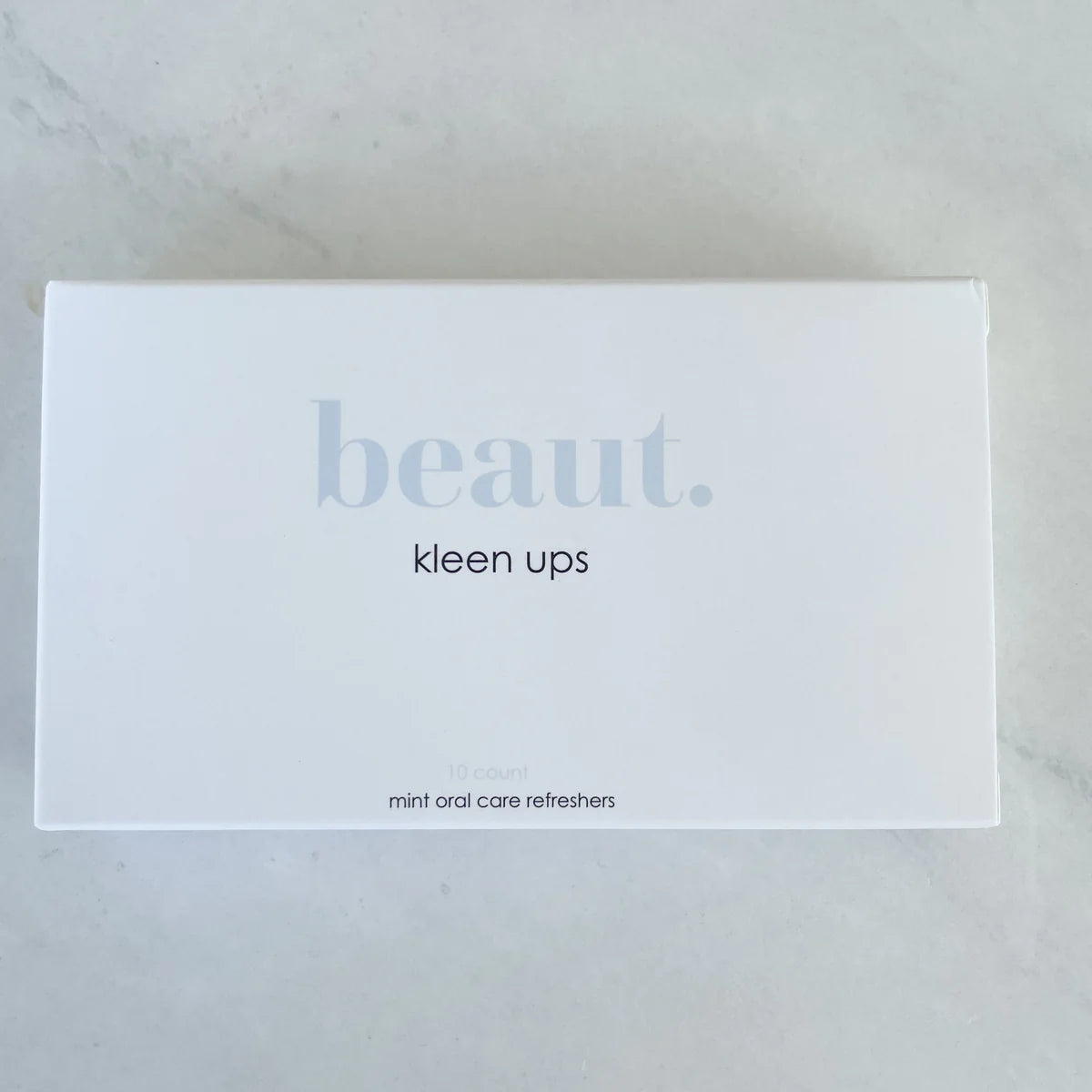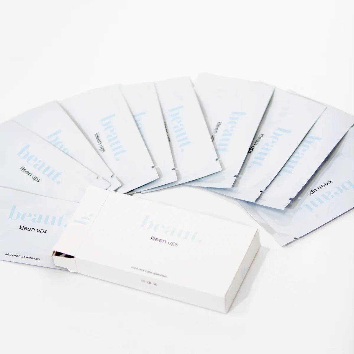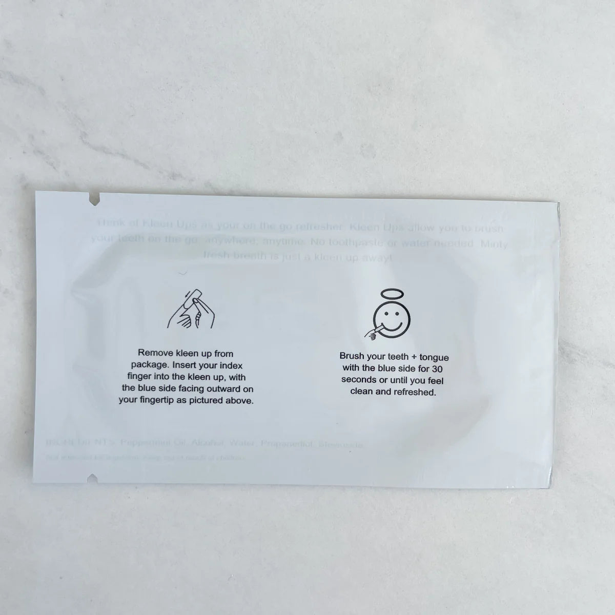 What: Kleen Ups are mint oral care refreshers that come in a pack of 10. Think of Kleen Ups as your on the go refresher. Kleen Ups allow you to brush your teeth on the go: anywhere, anytime. No toothpaste or water needed. Minty fresh breath in under 30 seconds