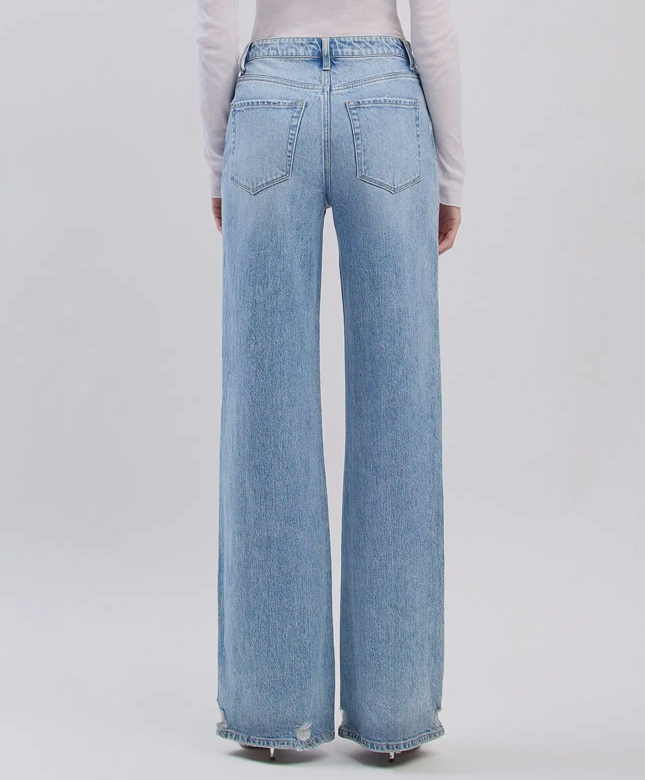 Comfort stretch denim, super high rise waist, distressed detail, full length, baggy wide leg jeans
