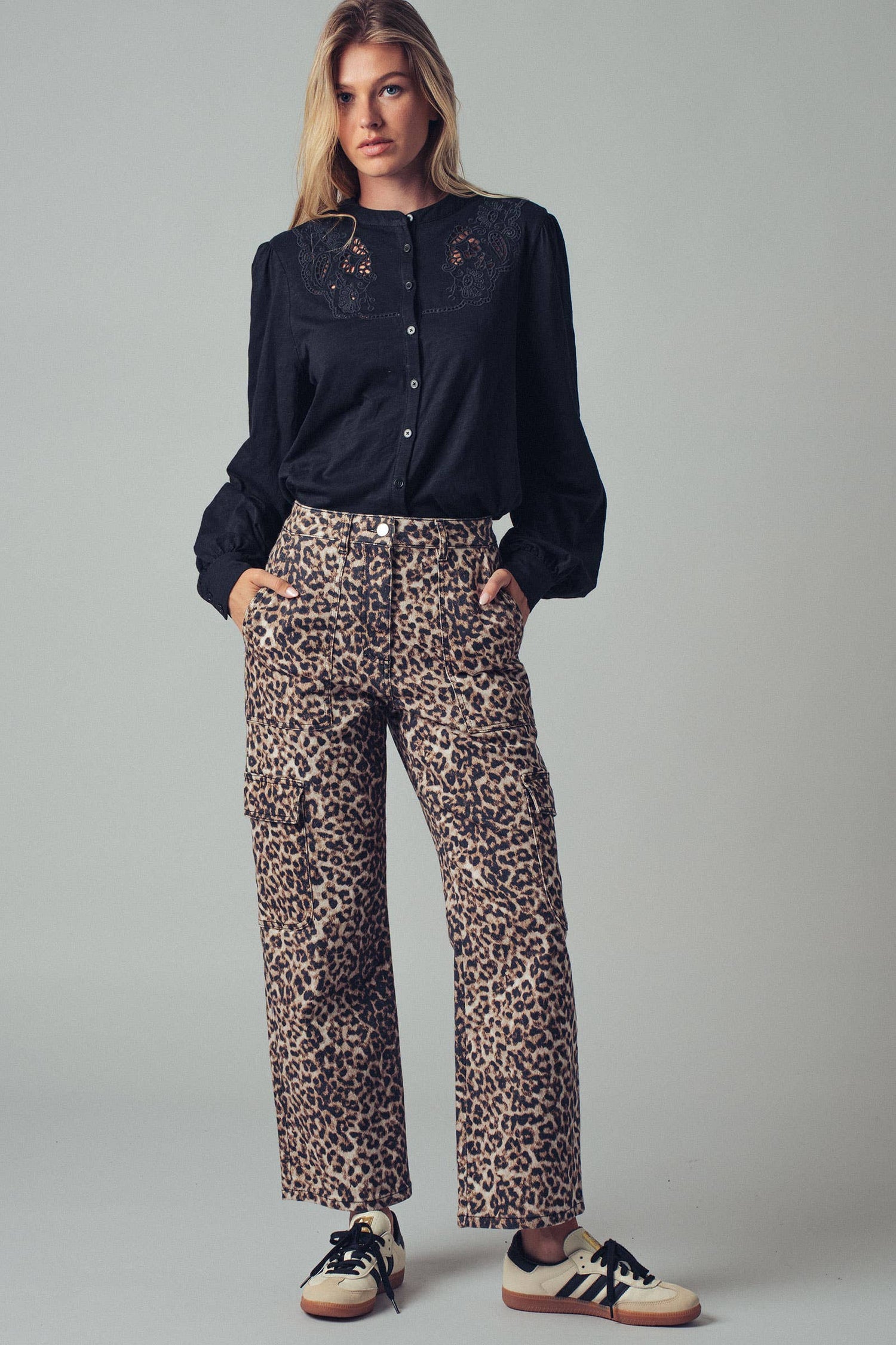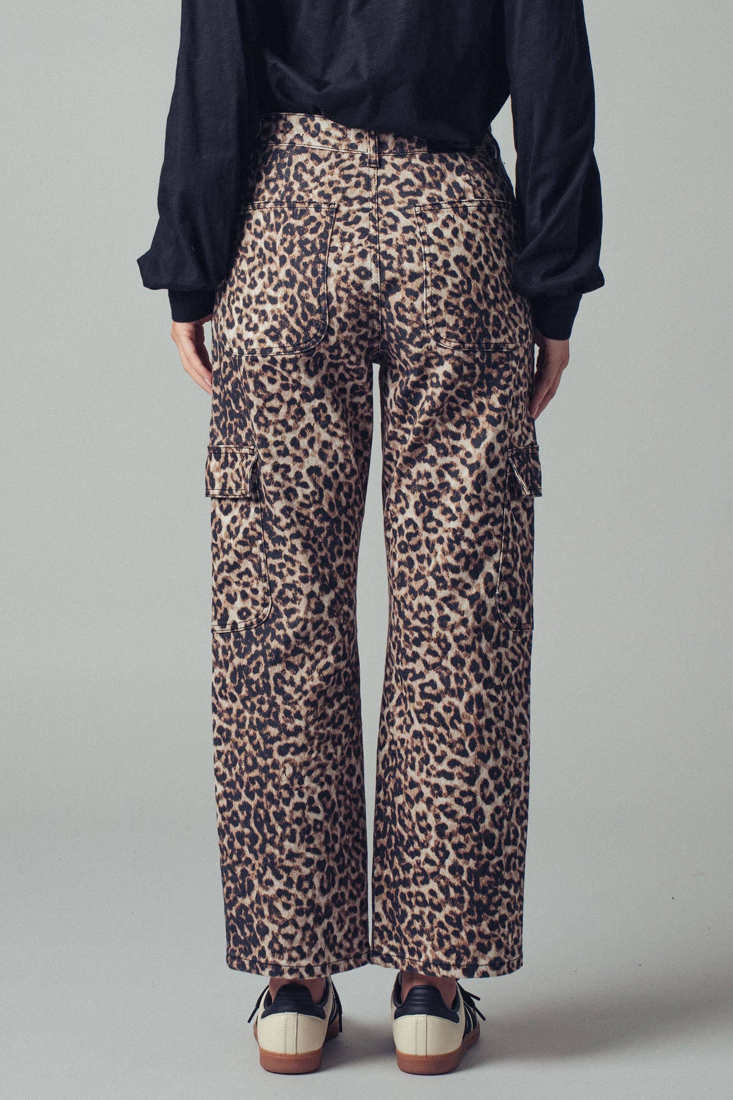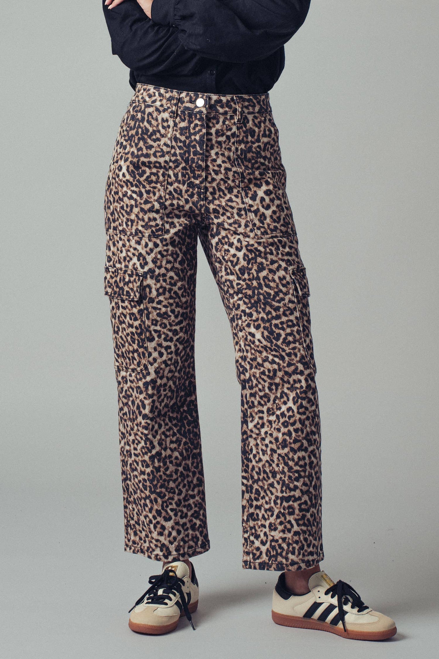 These straight-legged cropped cargo pants feature a bold leopard print, adding a touch of wild style to any outfit. With functional cargo pockets and a comfortable fit, they combine fashion and practicality for everyday wear. Features: • 97% Cotton, 3% Spandex •
