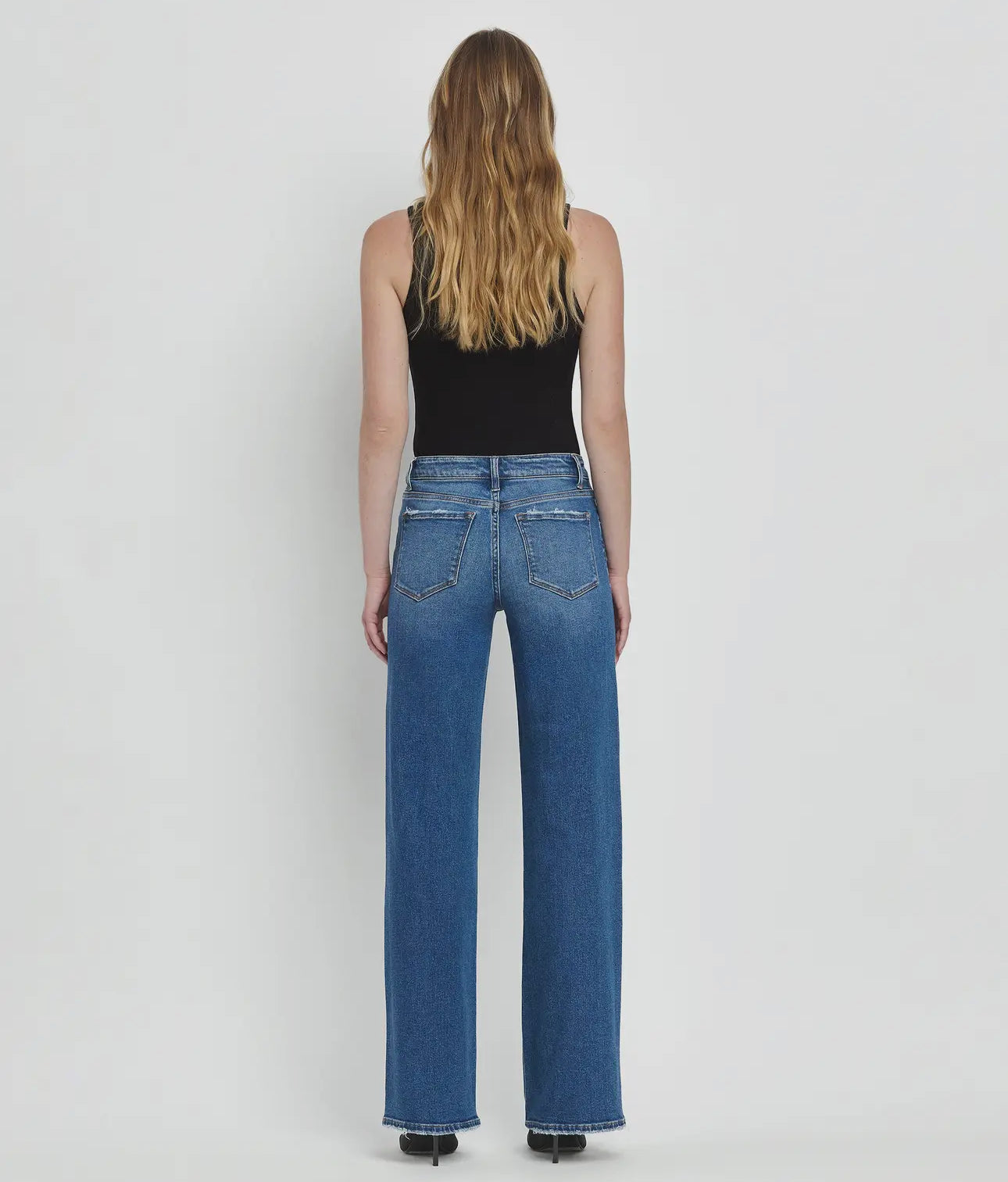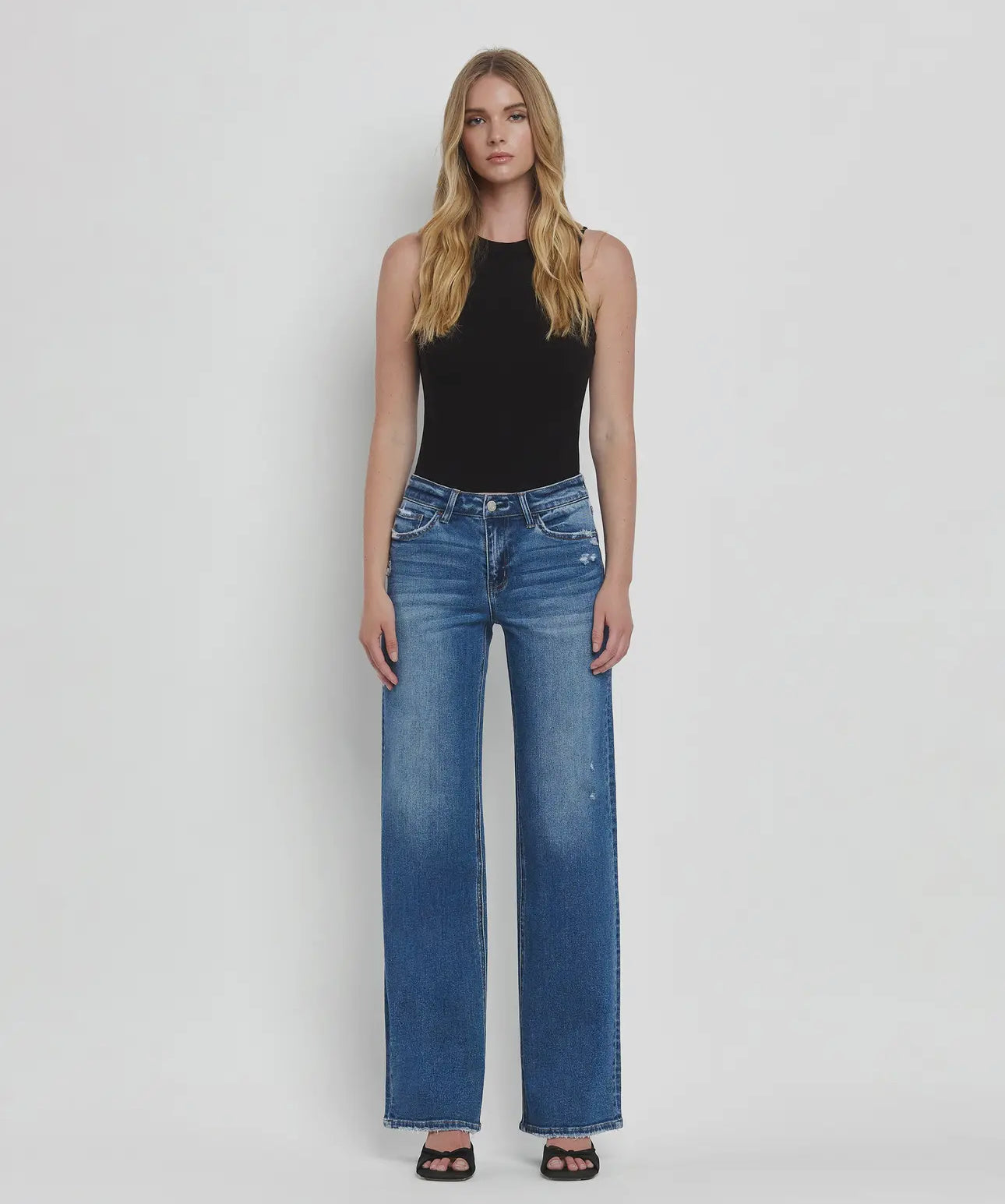 Comfort stretch denim, mid rise waist, 5 pockets, lightly distressed detail, full length, medium dark wash, wide leg jeans