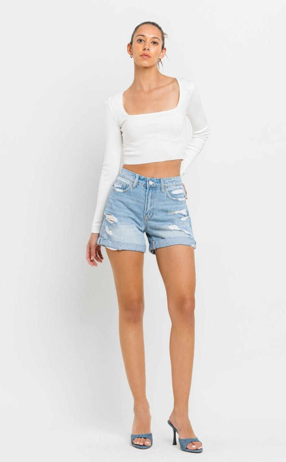 Non-stretch denim, mid-rise waist, distressed detail, double cuff hem, boyfriend shorts