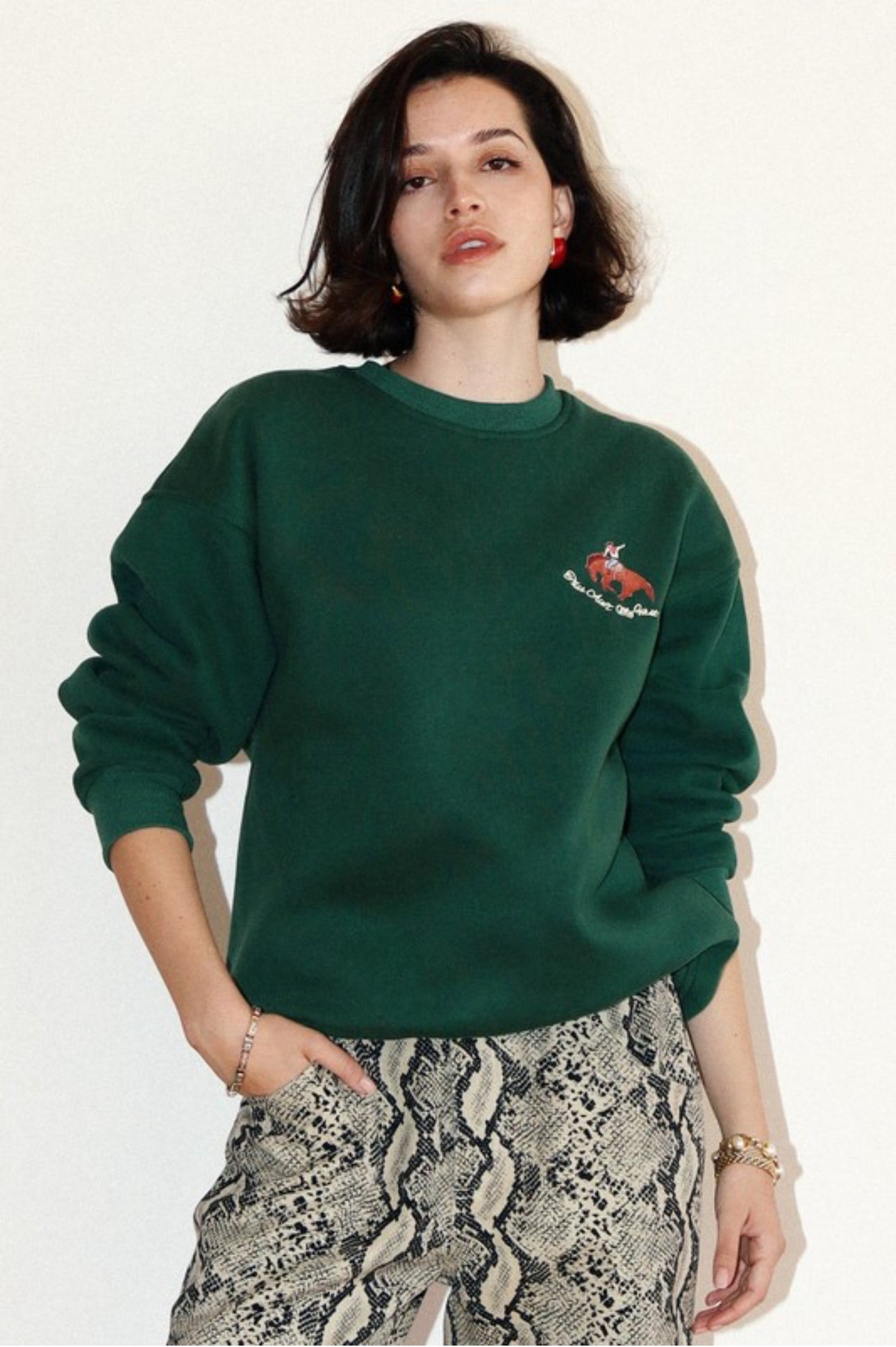 Cozy meets Western edge in the See You Cowboy Sweatshirt. Crafted in a deep forest green, this oversized crewneck features a playful embroidered cowboy graphic on the front and bold “See You Cowboy” lettering across the back. Designed with a relaxed fit and soft interior, it’s the perfect throw-on piece for casual days, road trips, or layering over your favorite denim.