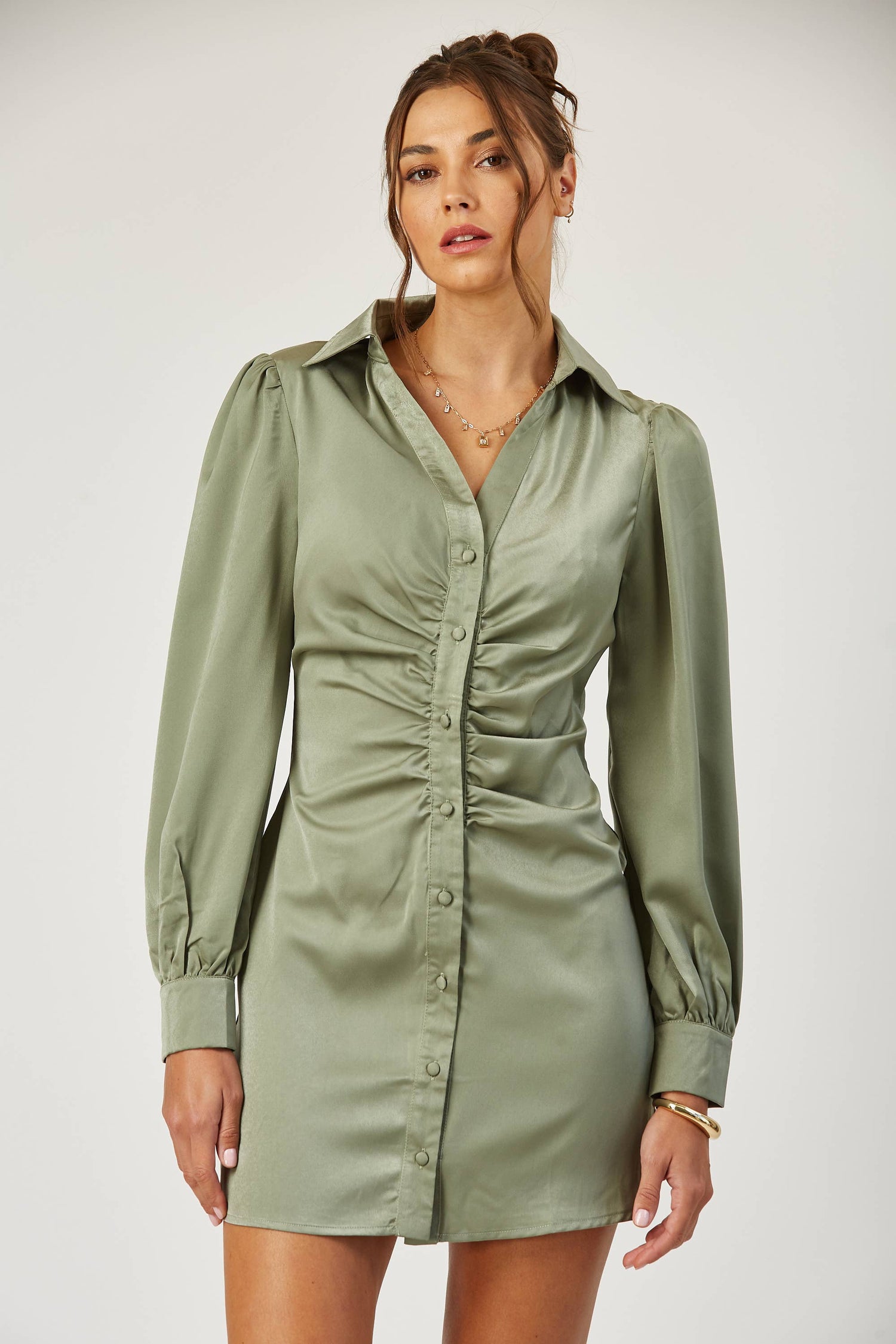 Collared Cinched Waist shirtdress Button front closure Long cuffed sleeve Unlined Model is 5'10" and is wearing a size S Item runs small Highest point of shoulder to longest part of hem measurement is approx 33.5" in length Self: 100% Polyester Hand wash cold, Line dry This is a Satin fabric with a smooth handfeel