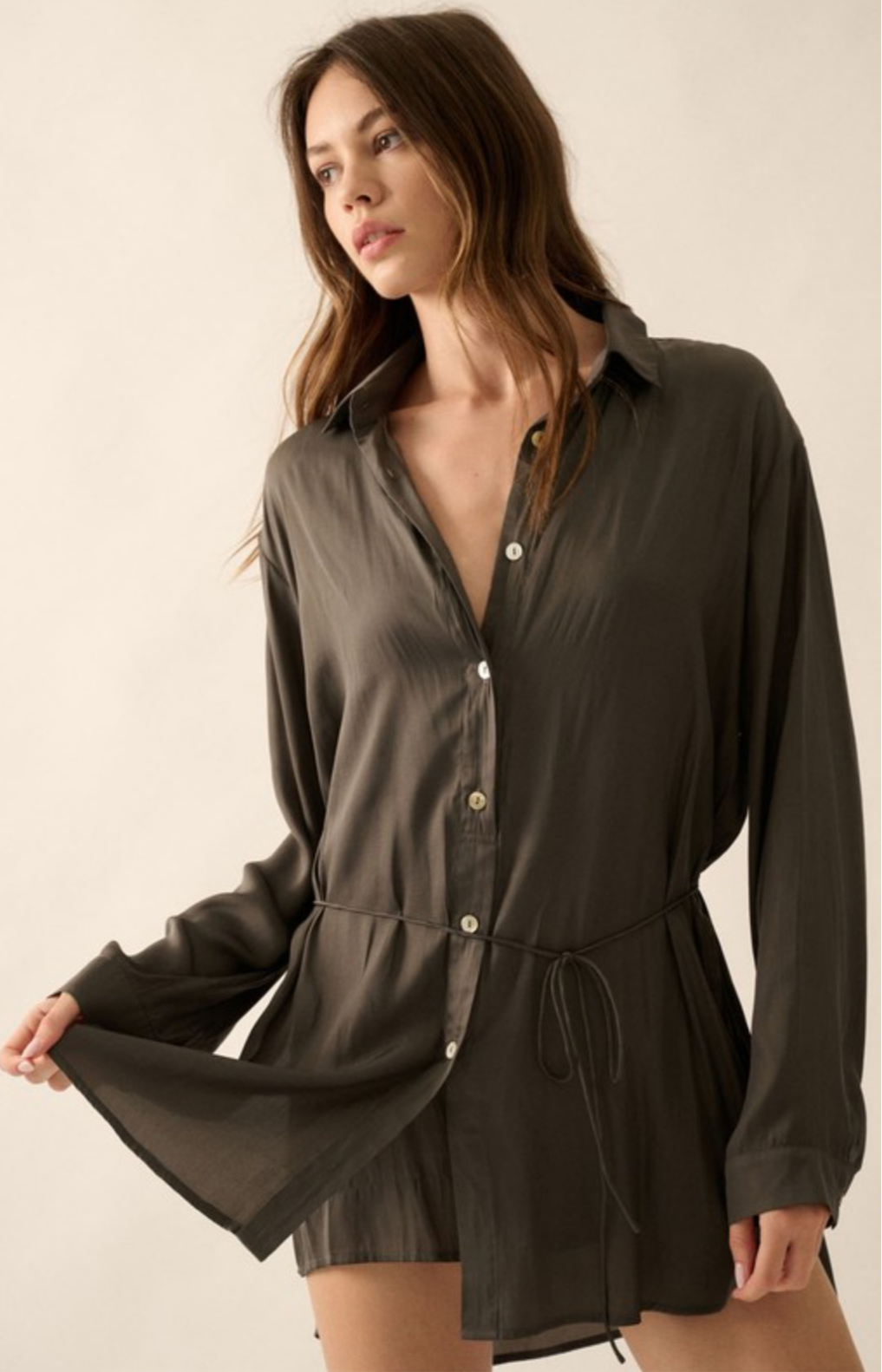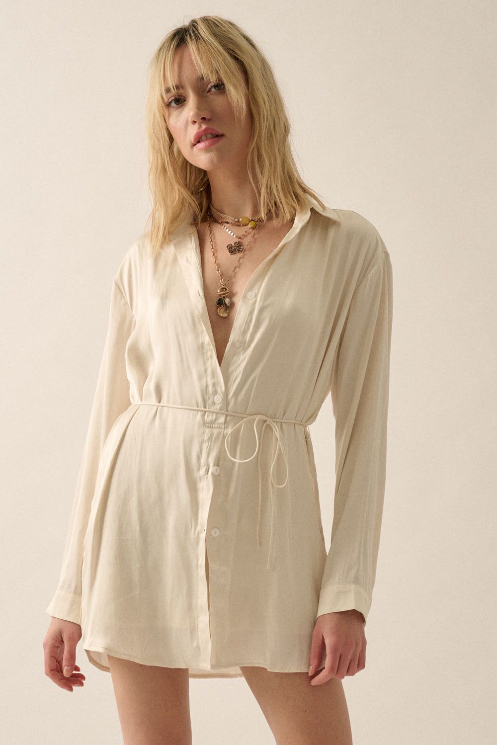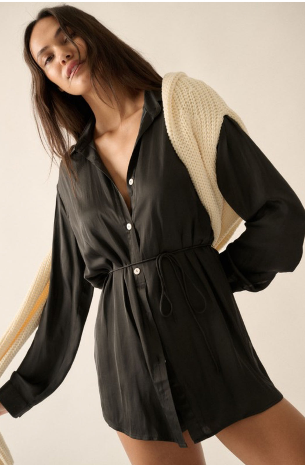 A solid, satin romper with the following features: Layered design with dress shirt overlayer and shorts lining. Collared neckline. Long sleeves with buttoned cuffs. Drop shoulder. Button-front closure. Removable tie belt. Side slits. Yoke back. Curved shirttail hem. Thigh length. Relaxed fit. Model Info: Height: 5 ft 11 in | Bust: 32.5 in | Waist: 24 in | Hips: 35 in | Wearing Size S.