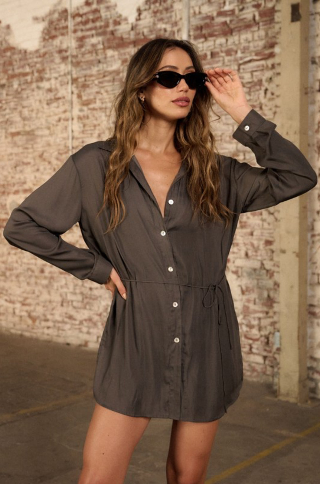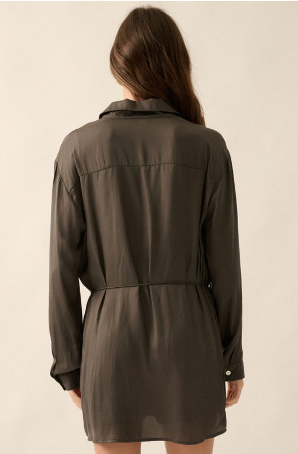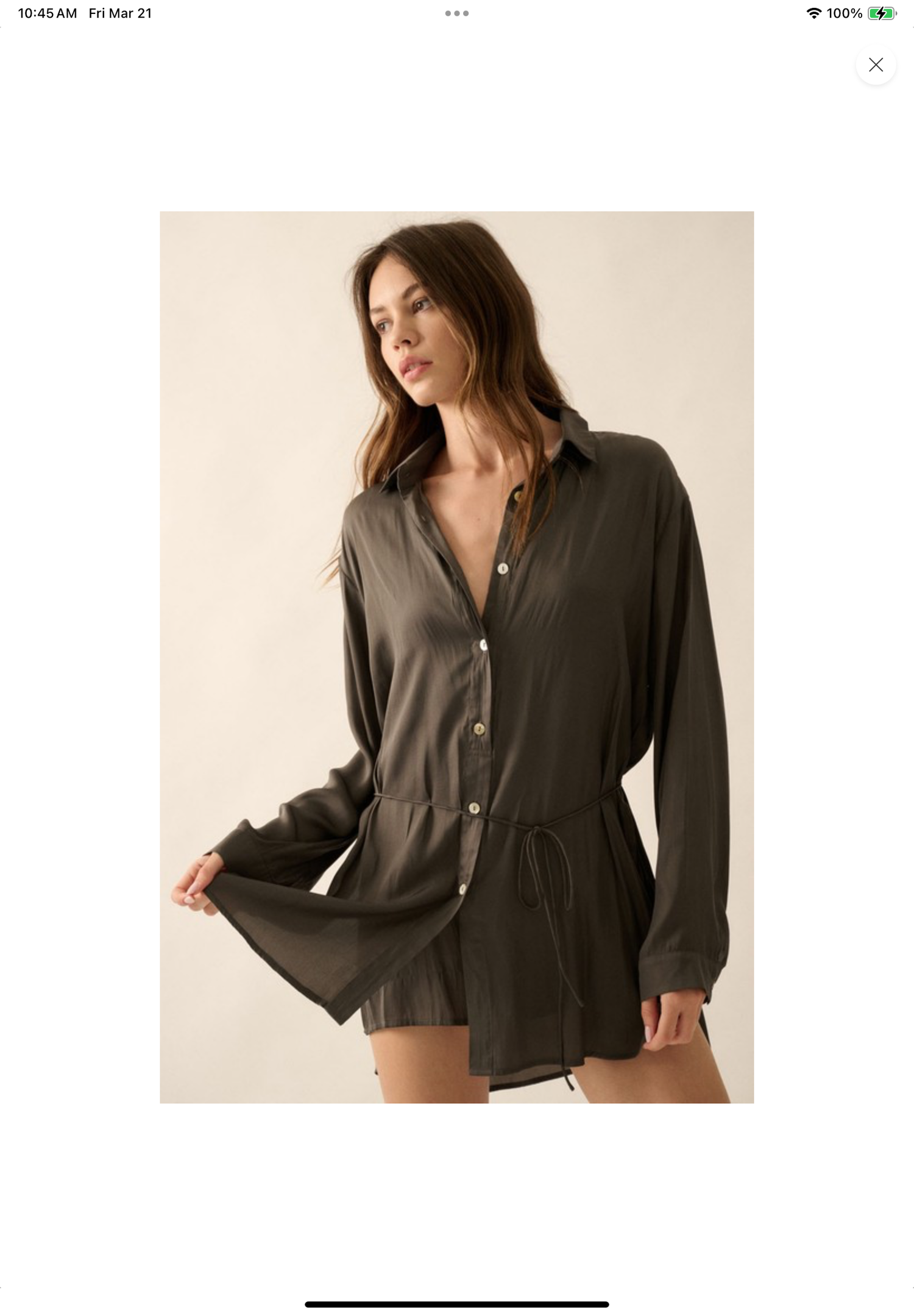 A solid, satin romper with the following features: Layered design with dress shirt overlayer and shorts lining. Collared neckline. Long sleeves with buttoned cuffs. Drop shoulder. Button-front closure. Removable tie belt. Side slits. Yoke back. Curved shirttail hem. Thigh length. Relaxed fit. Model Info: Height: 5 ft 11 in | Bust: 32.5 in | Waist: 24 in | Hips: 35 in | Wearing Size S.
