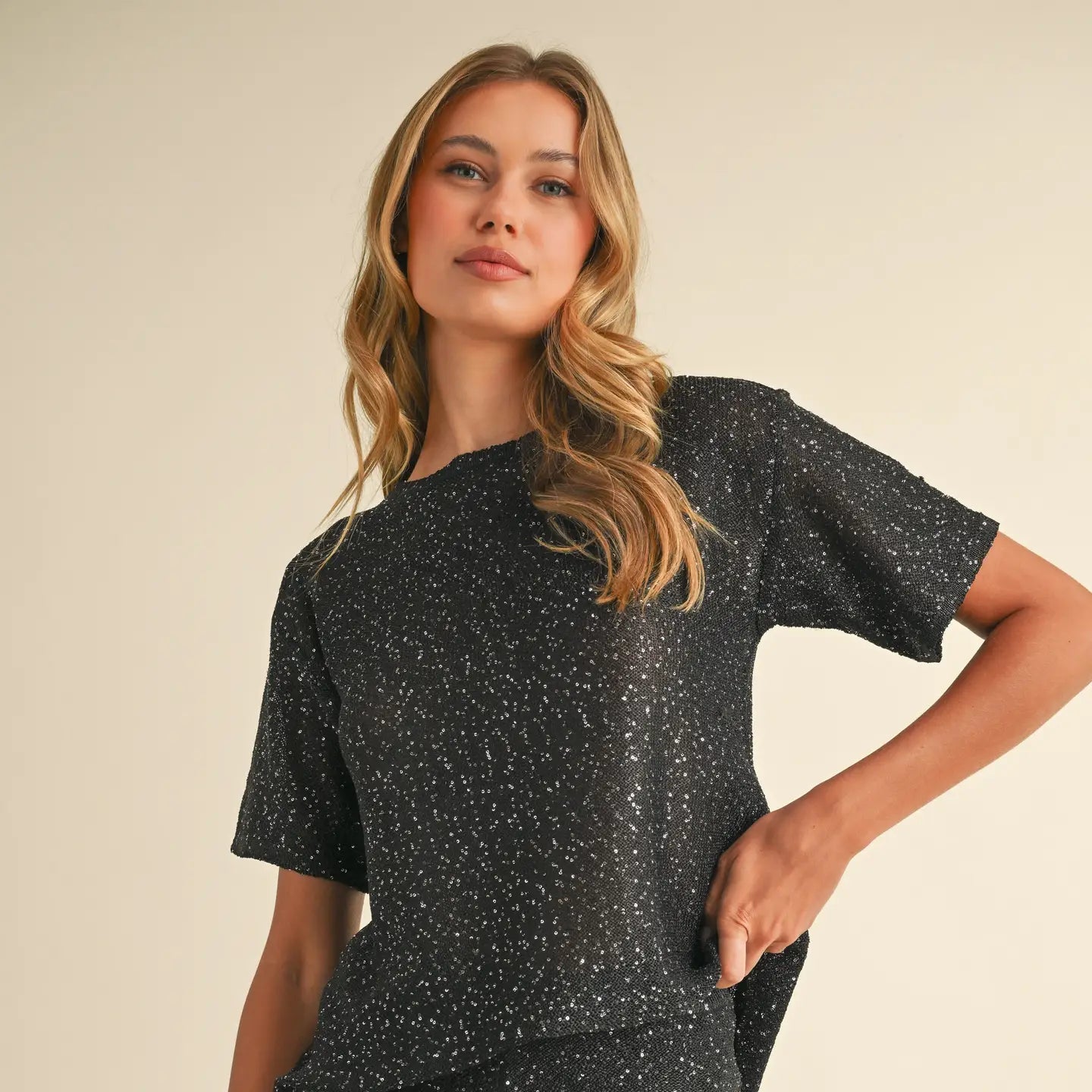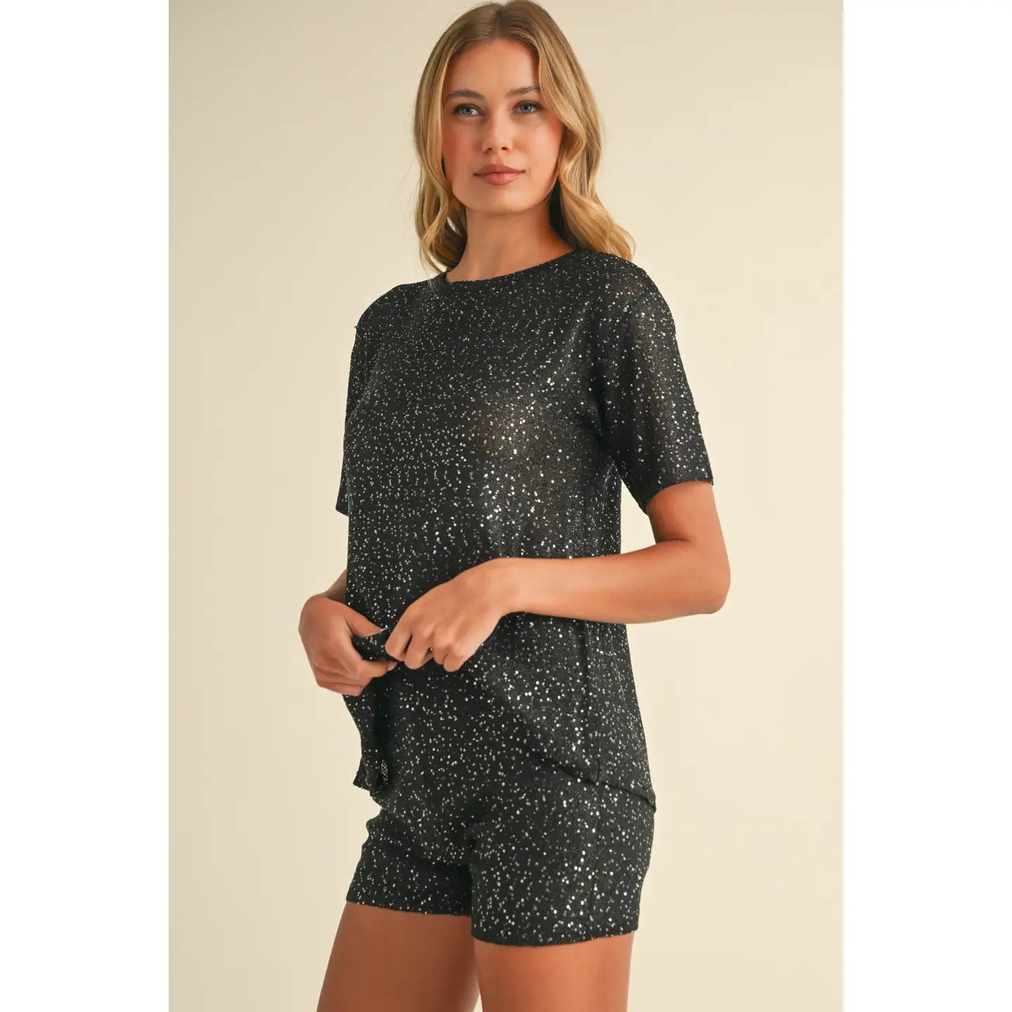 Sequin sweater top and shorts set 65% acrylic 35% polyester