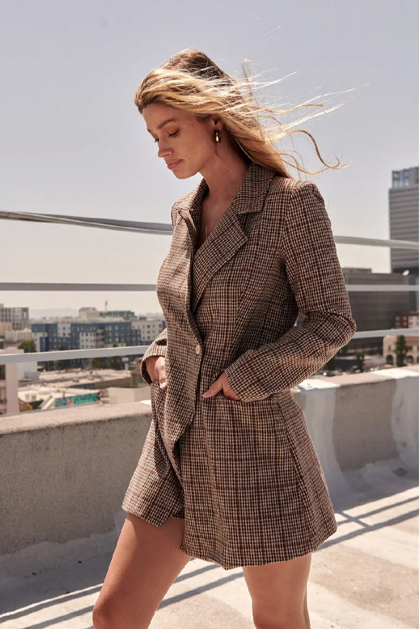 Meet The Bristol Plaid Romper — a tailored one-and-done piece that effortlessly blends structure and sophistication. Featuring a classic notch lapel collar, one-button closure, and subtle skort detailing in the front, this romper gives the illusion of a chic blazer dress with the comfort of shorts. The fitted silhouette and woven plaid fabric make it perfect for transitional seasons — polished enough for work, playful enough for a night out.
